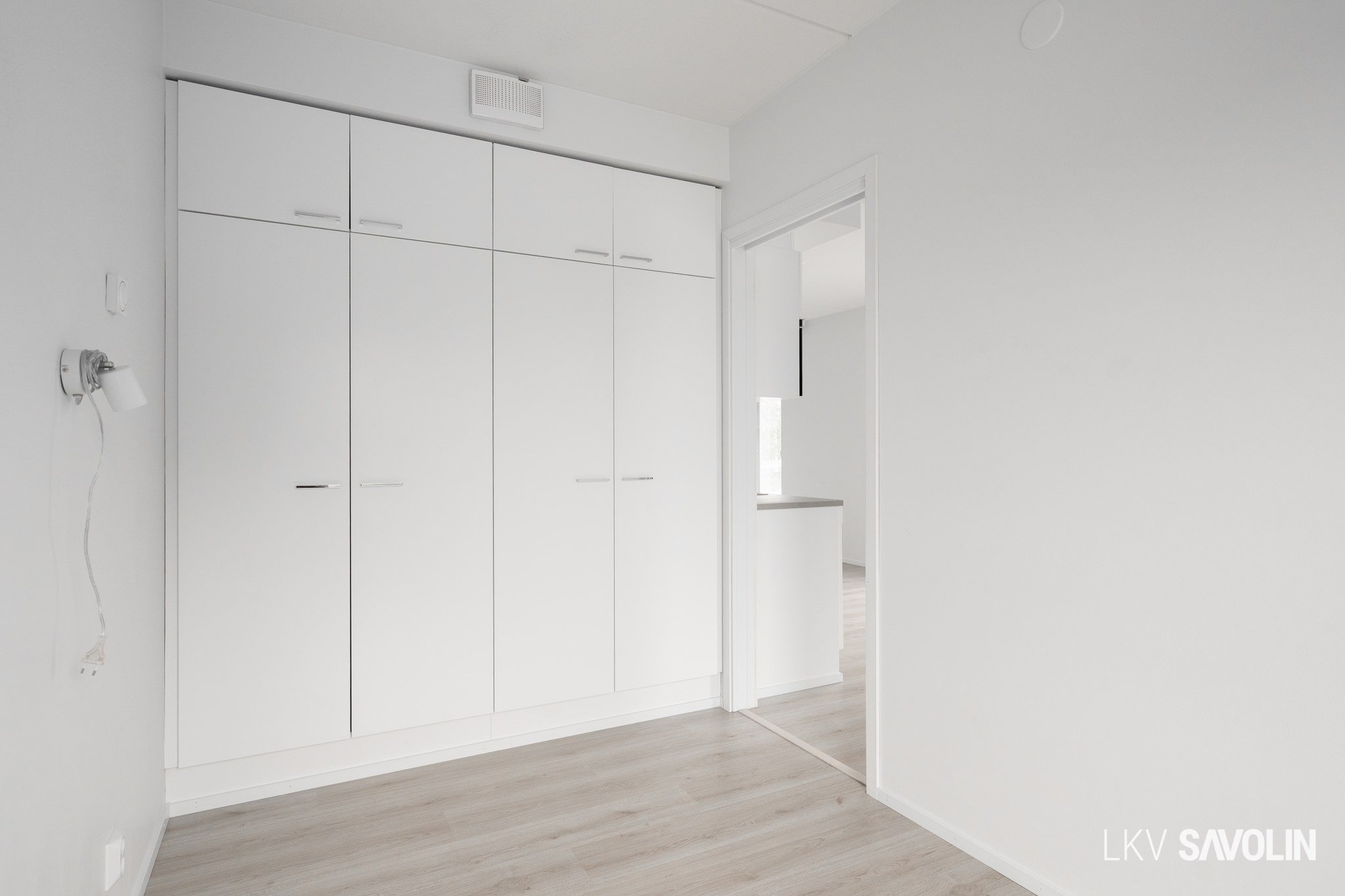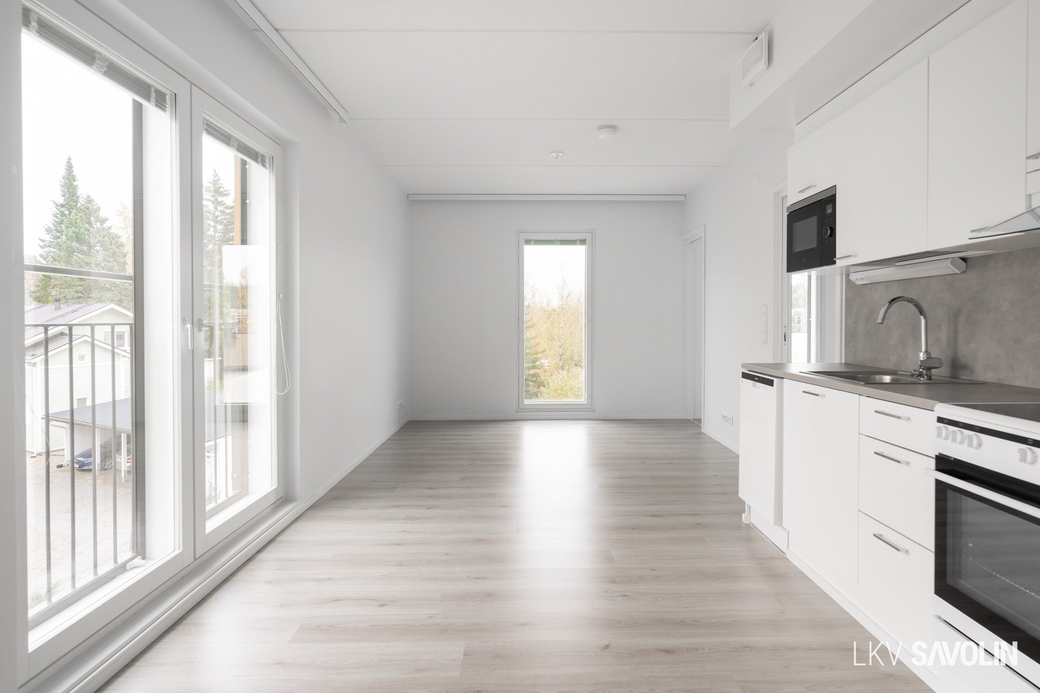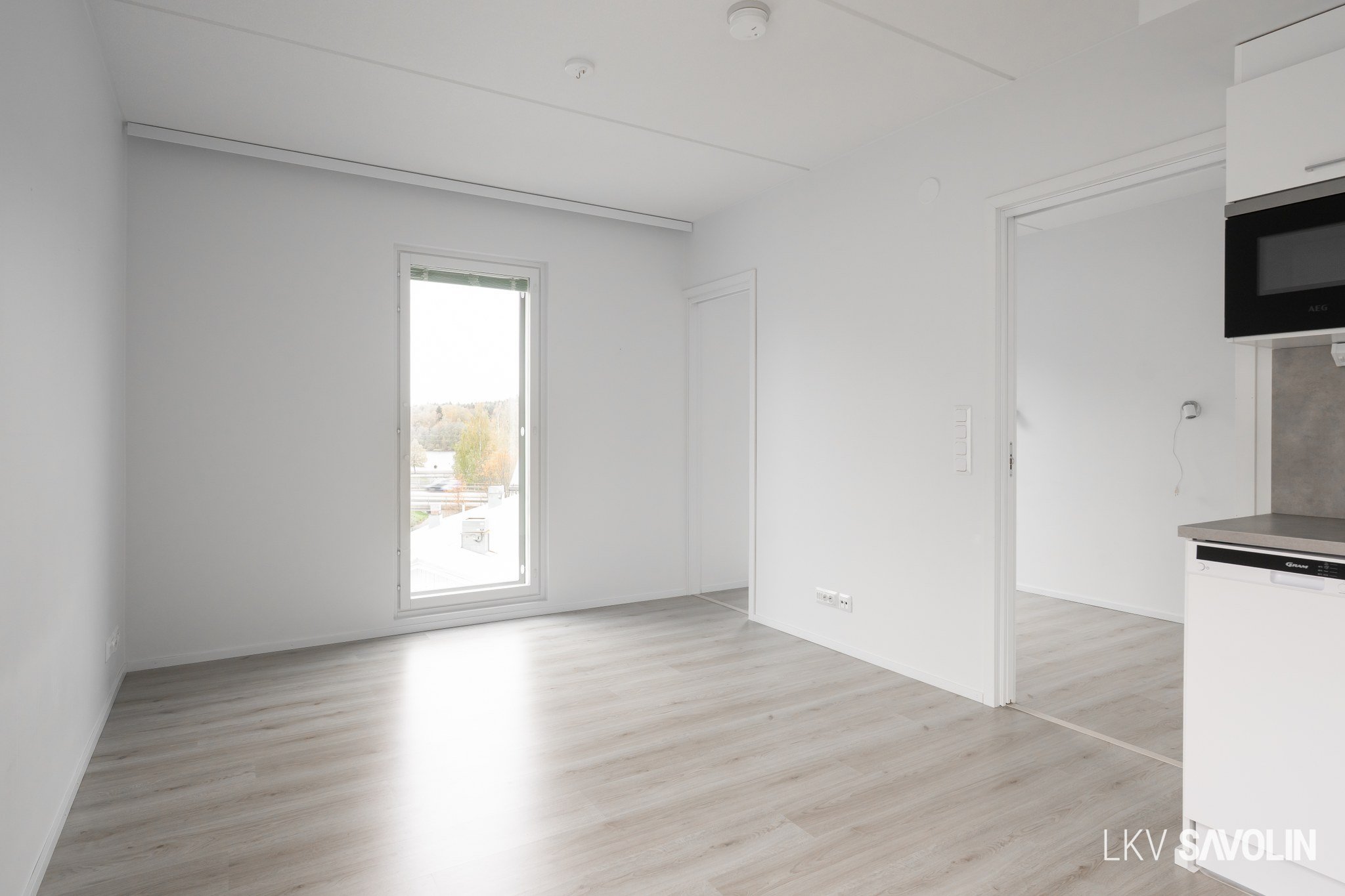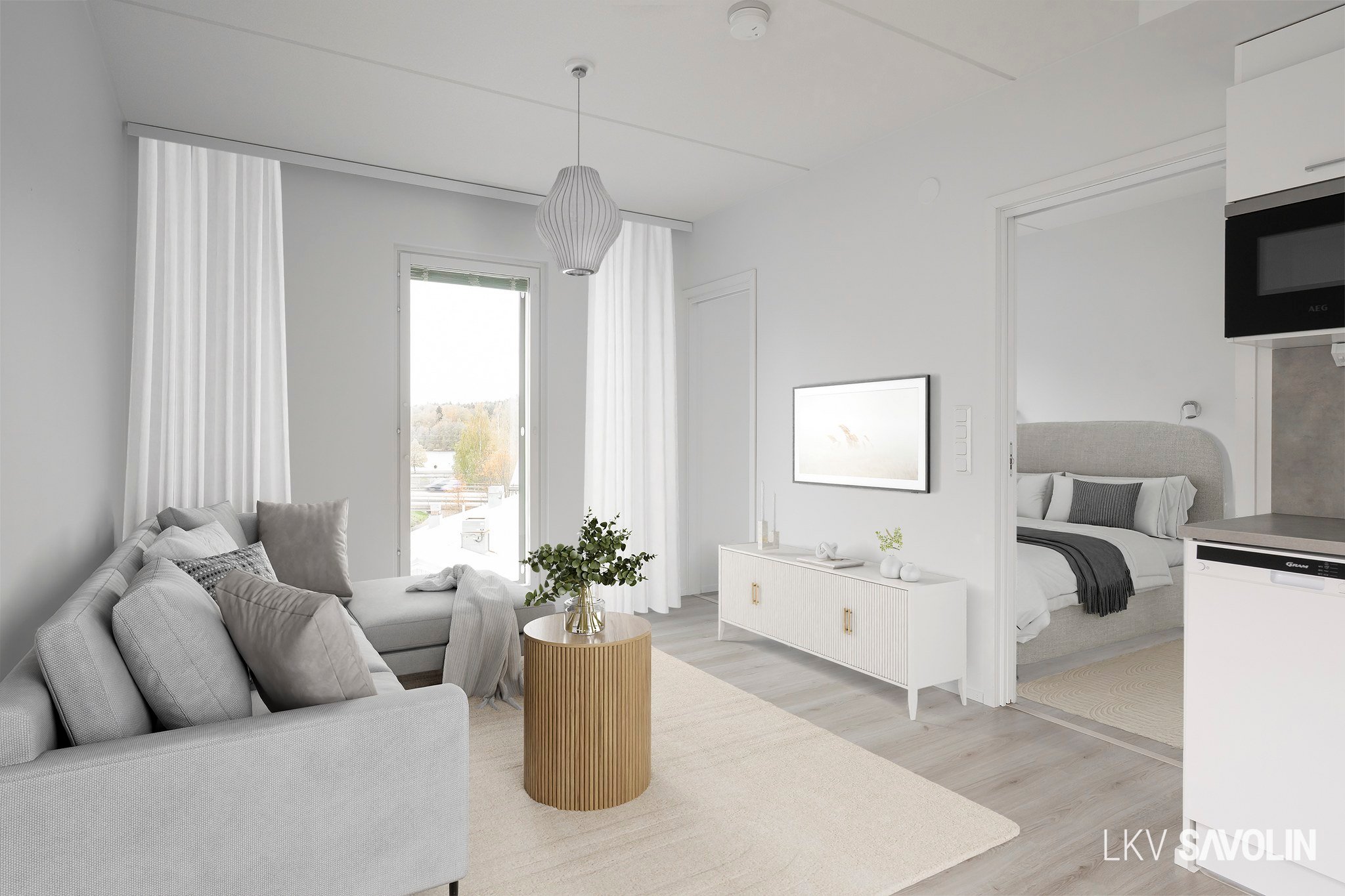Tässä toisen kerroksen kodissa on 45 neliötä ja pohjaratkaisu on erittäin toimiva. Säilytystilaa löytyy eteisestä, keittiöstä ja makuuhuoneesta sekä lisäksi kellarikerroksen erillisestä lämpimästä varastosta. Jyväsjärvi pilkottaa olohuoneen ja makuuhuoneen ikkunoista. Olohuoneessa on lisäksi ranskalainen parveke.