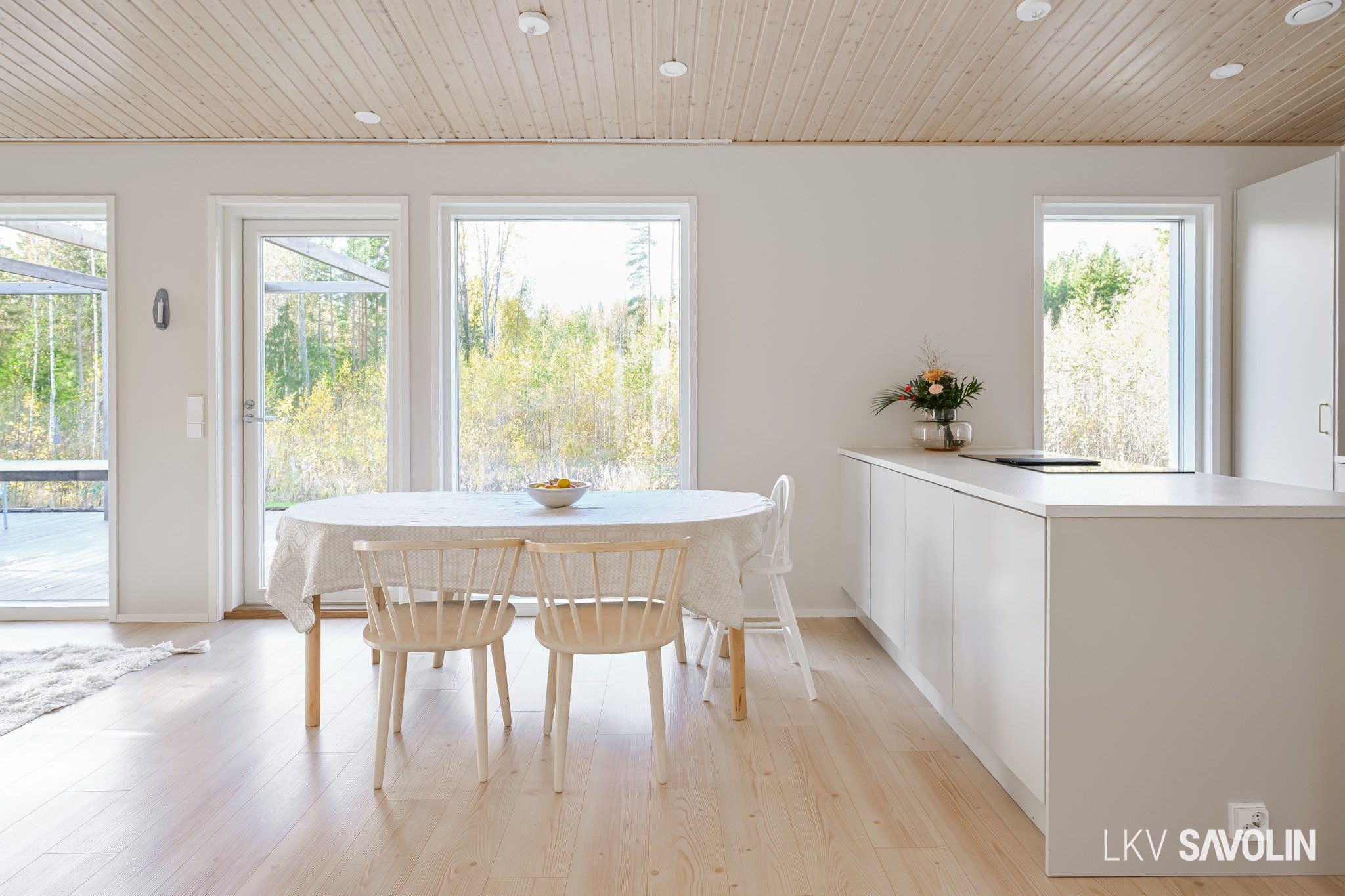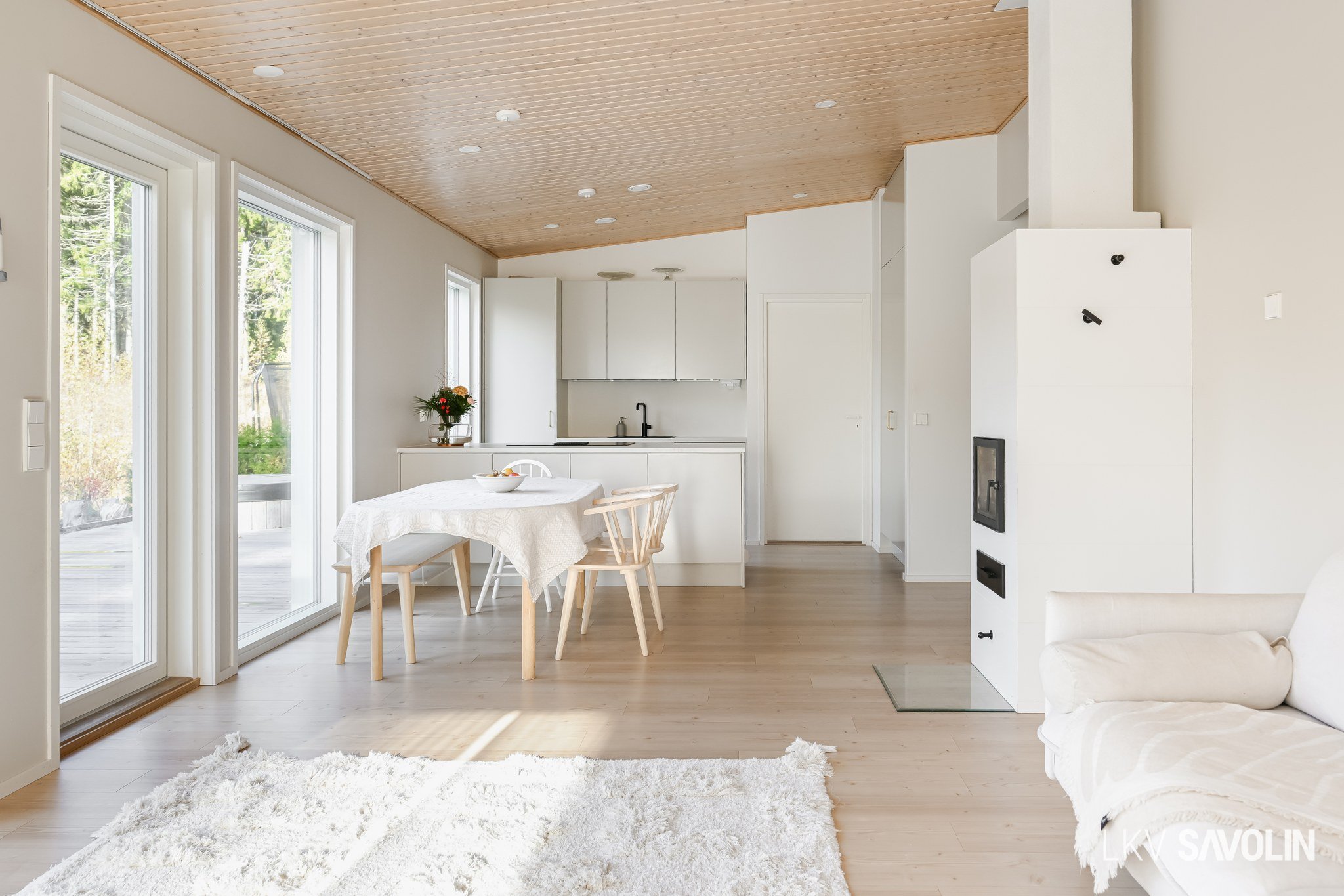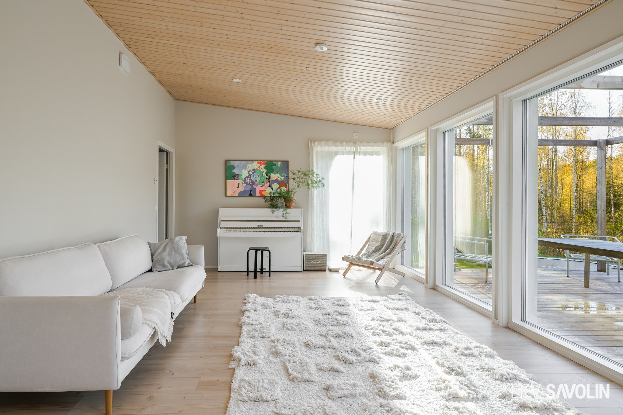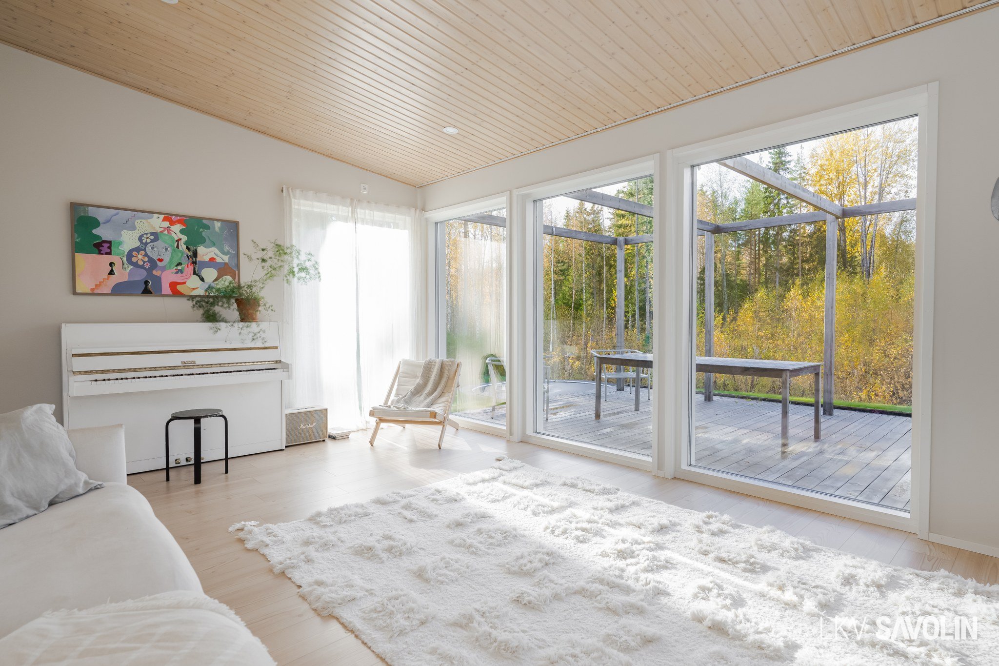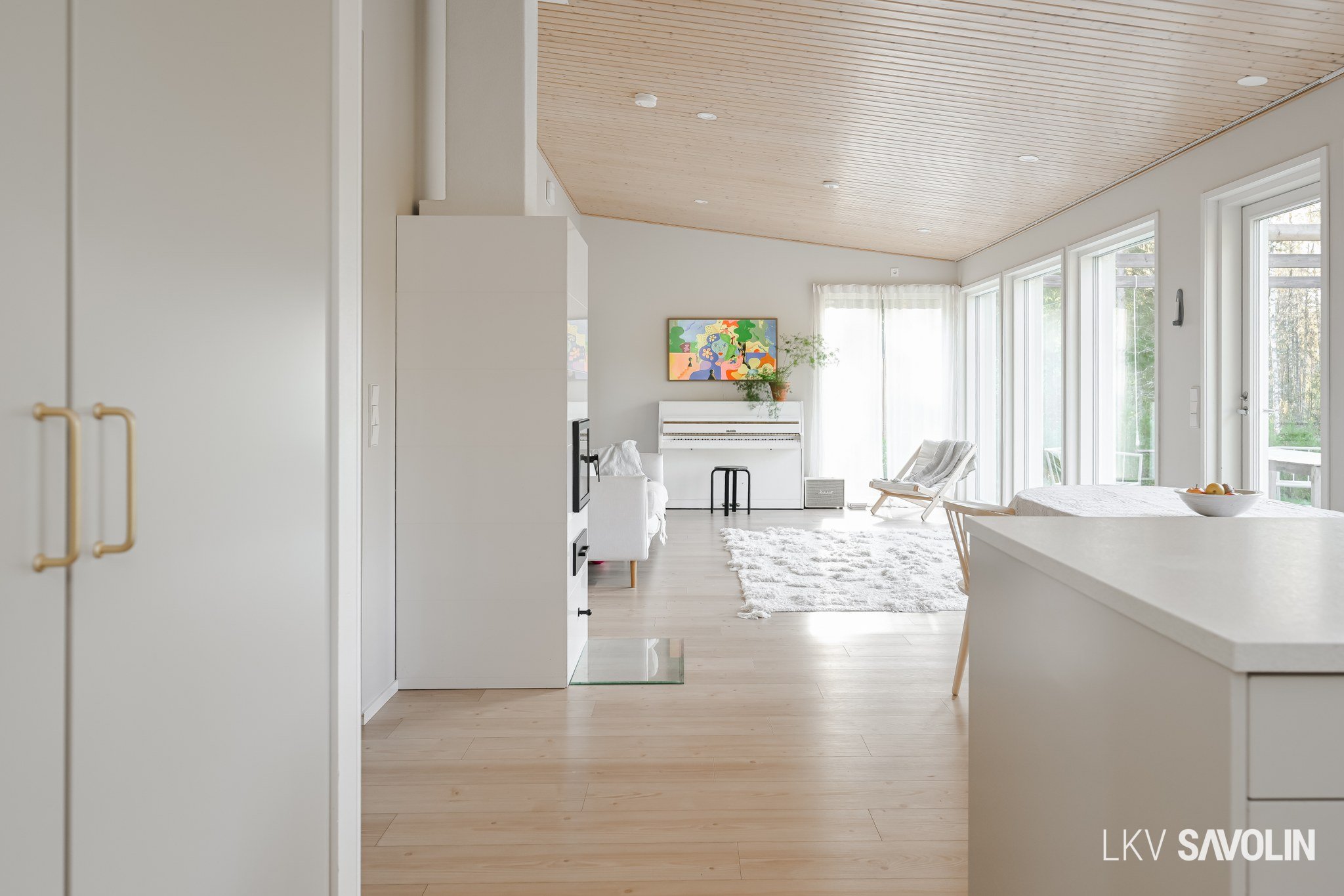Lattiasta kattoon olevat ikkunat tuovat runsaasti valoa sisätiloihin.