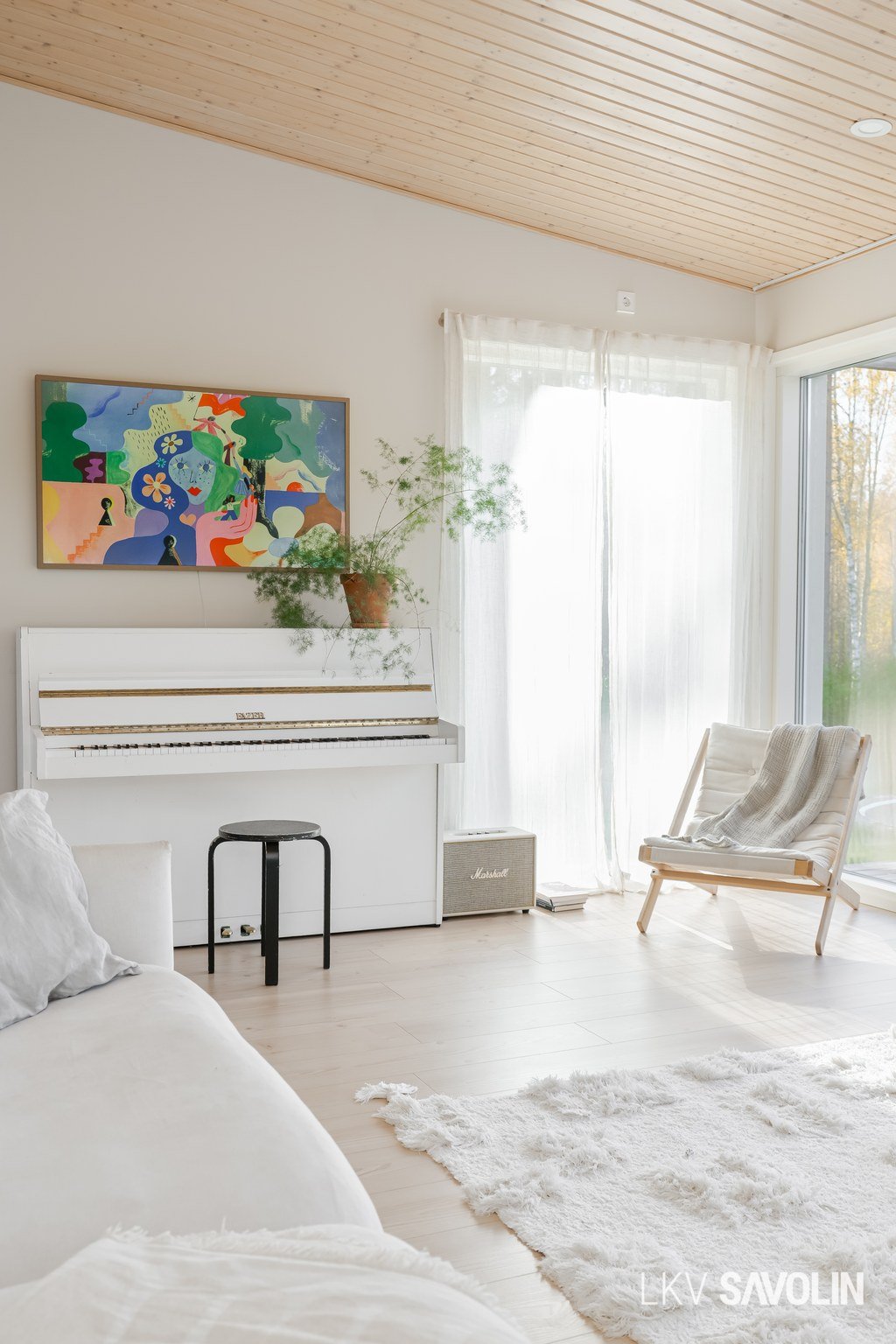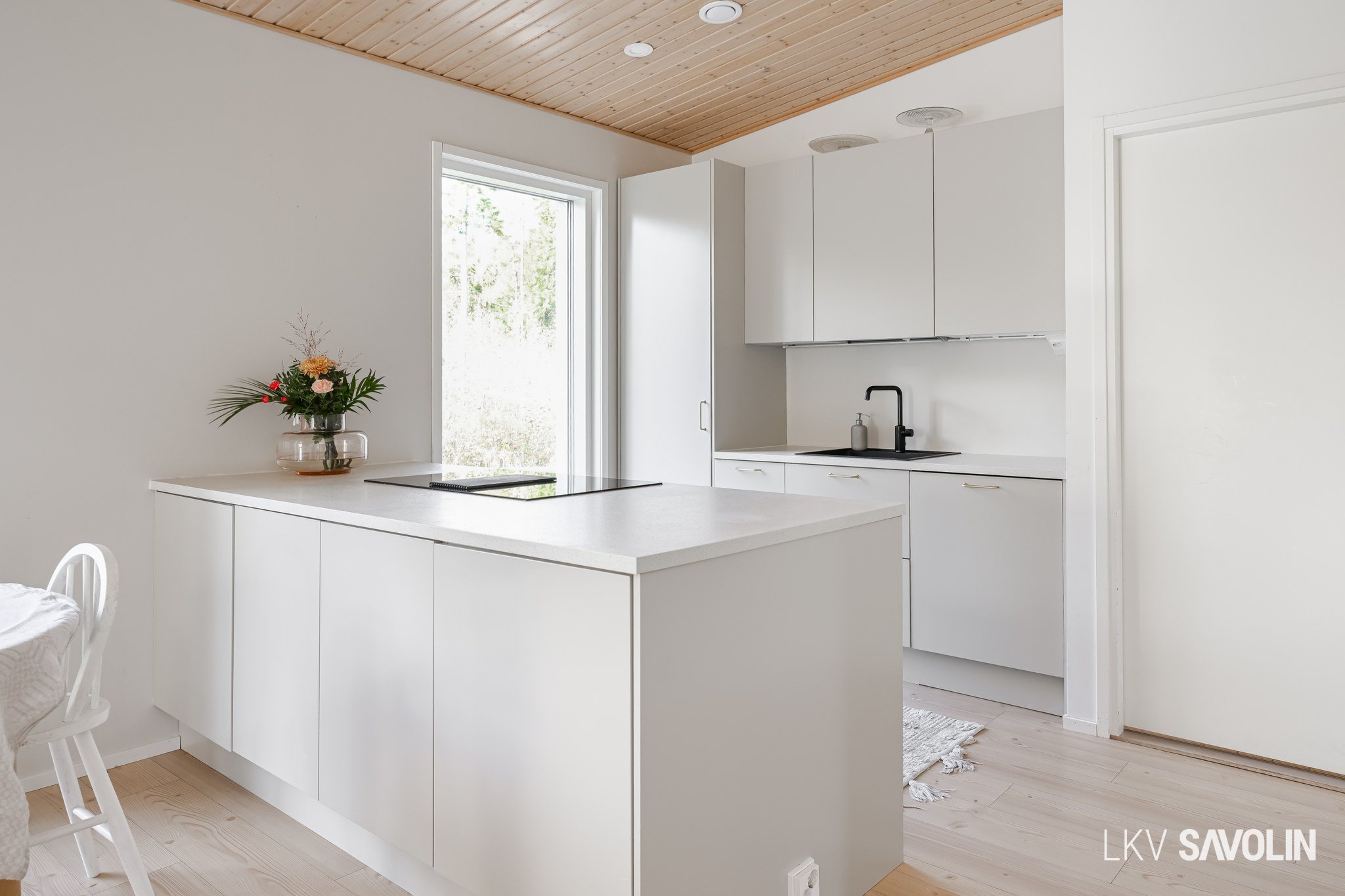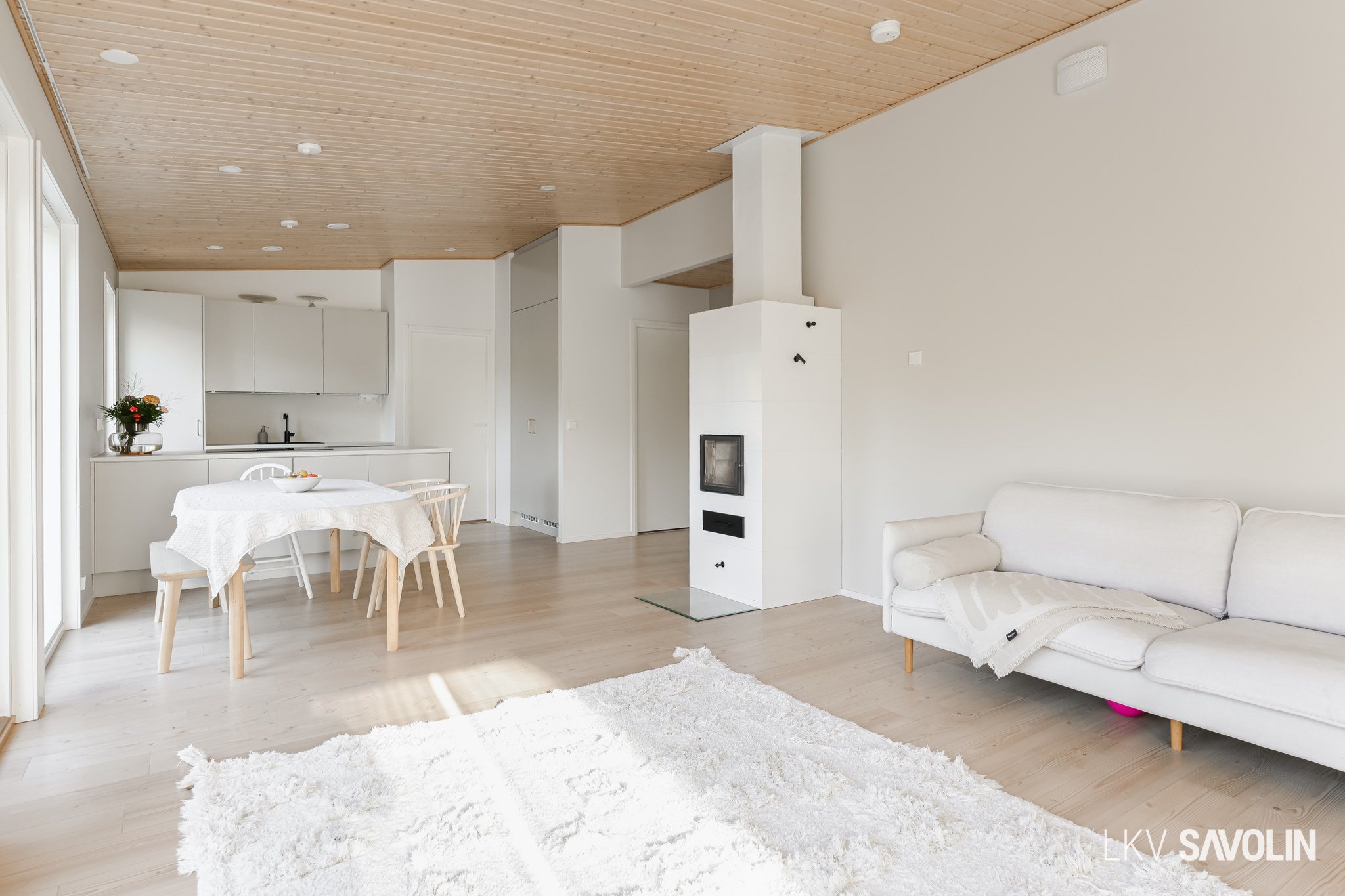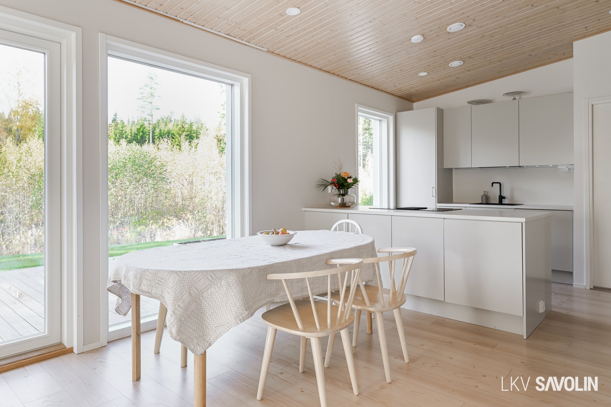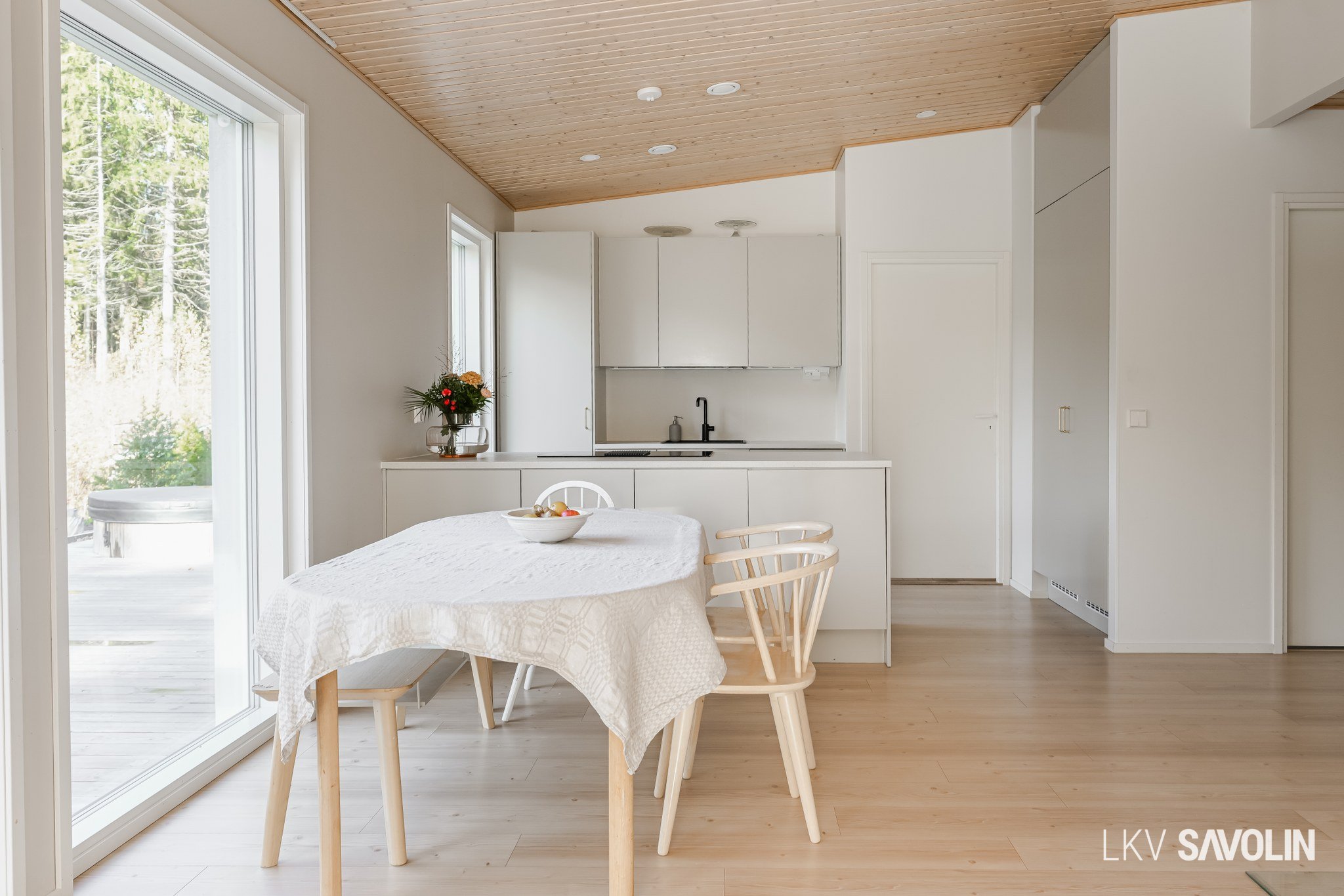 Lattiasta kattoon olevat ikkunat tuovat runsaasti valoa sisätiloihin.