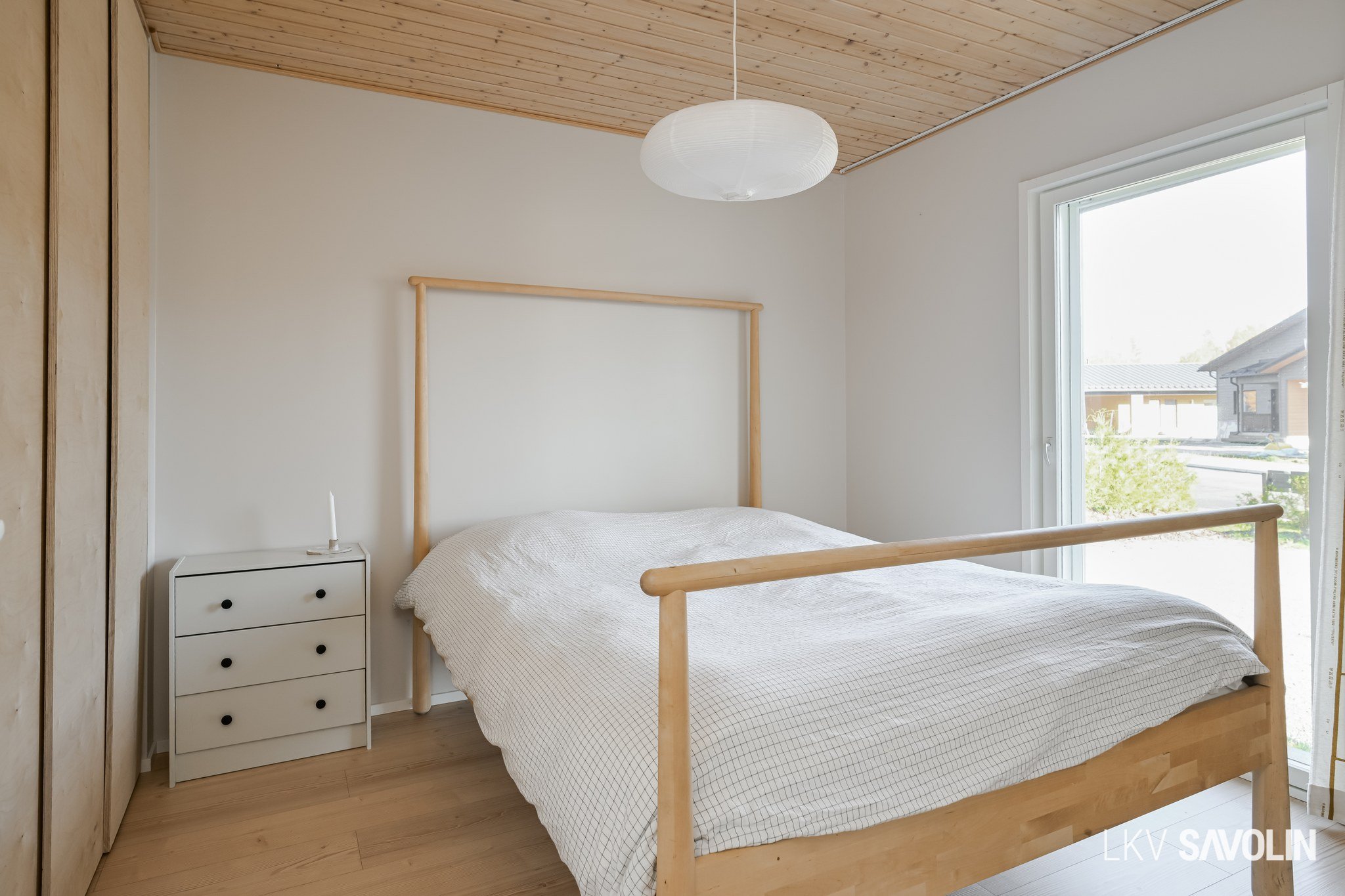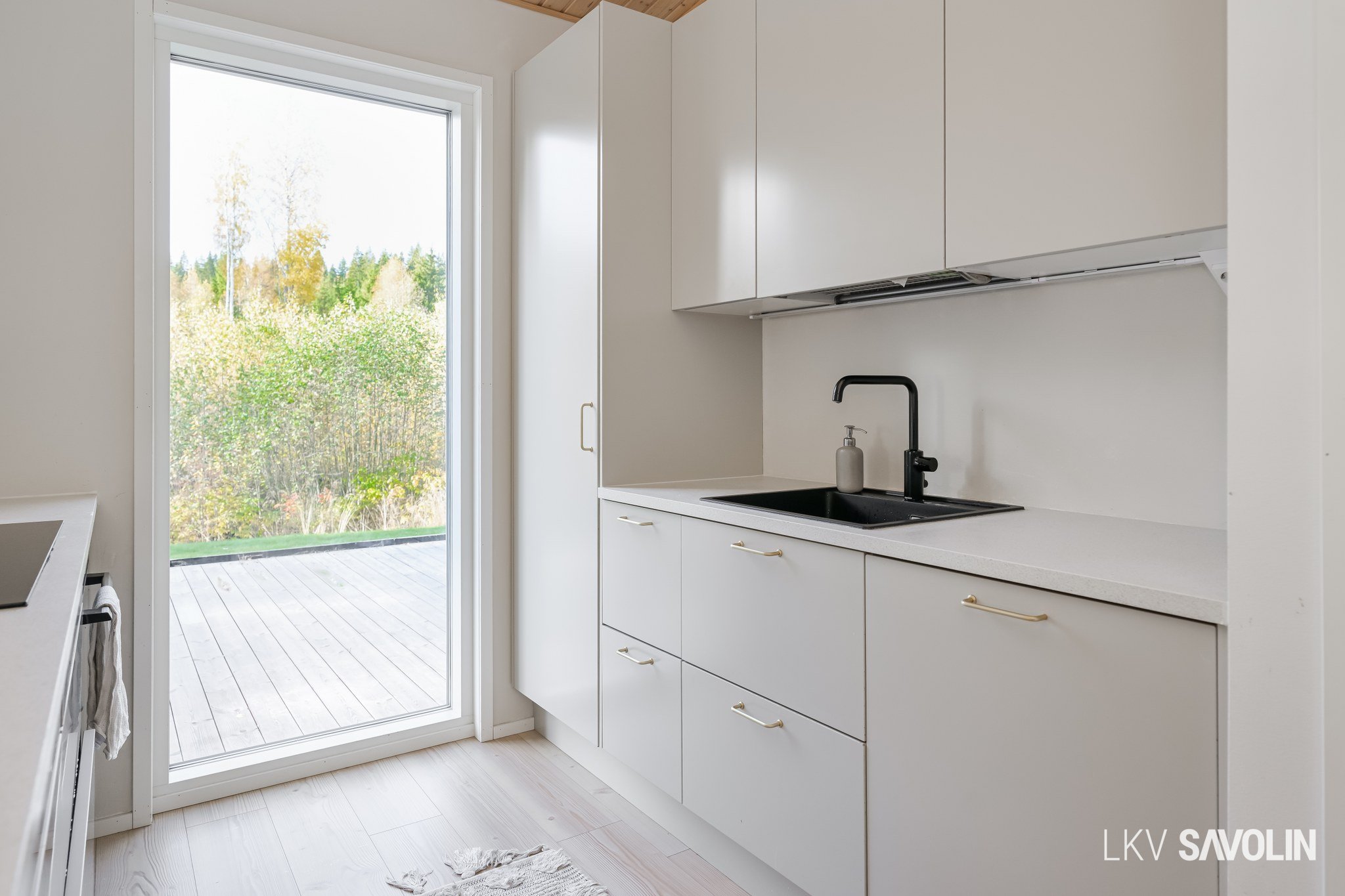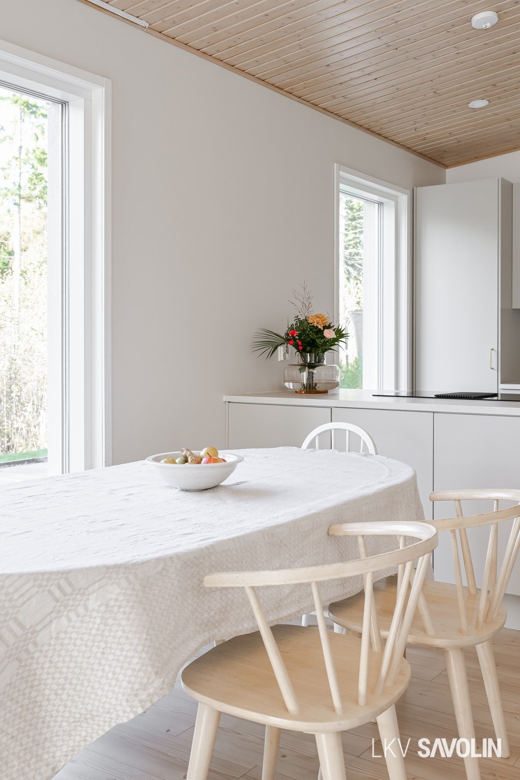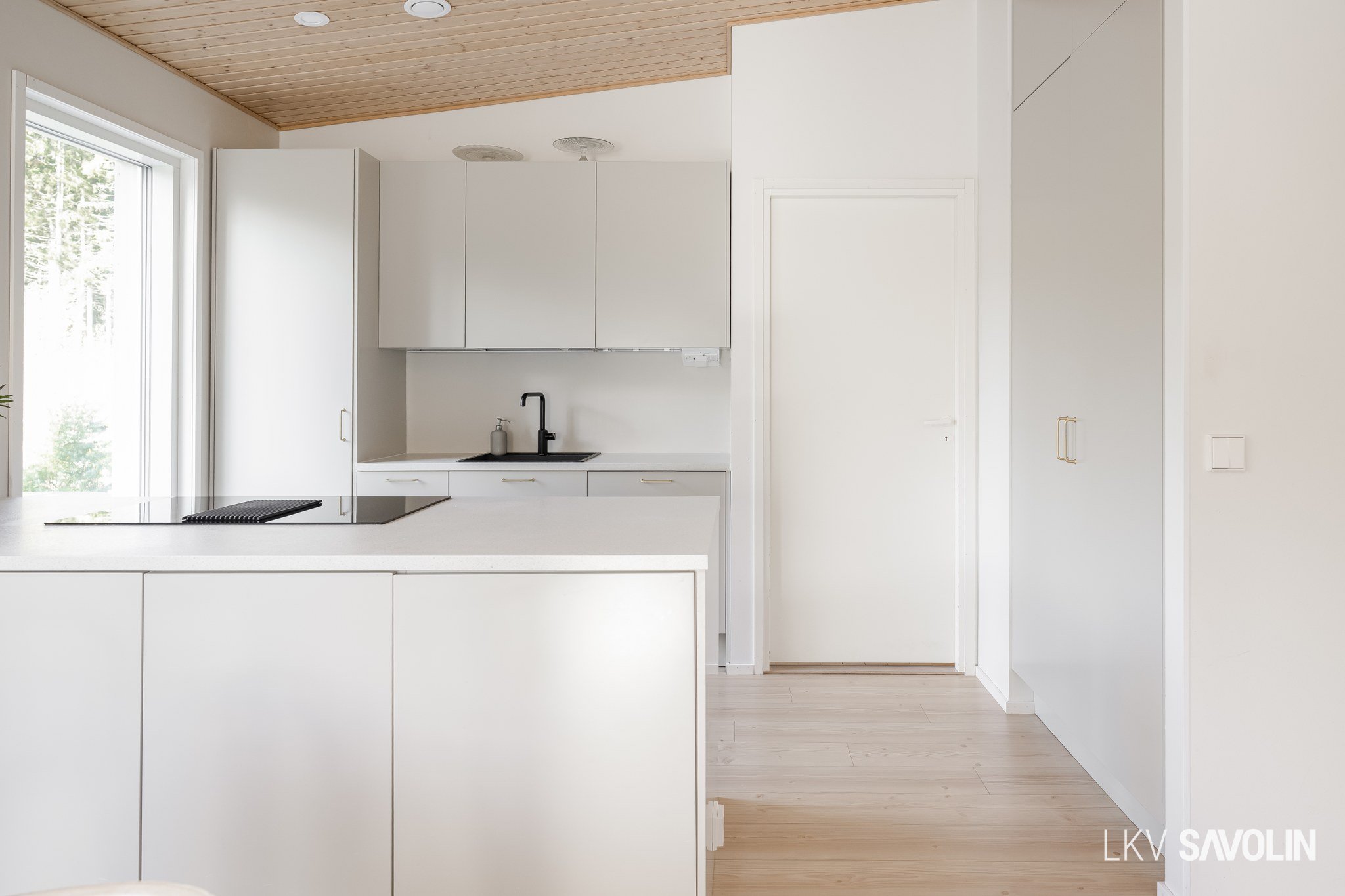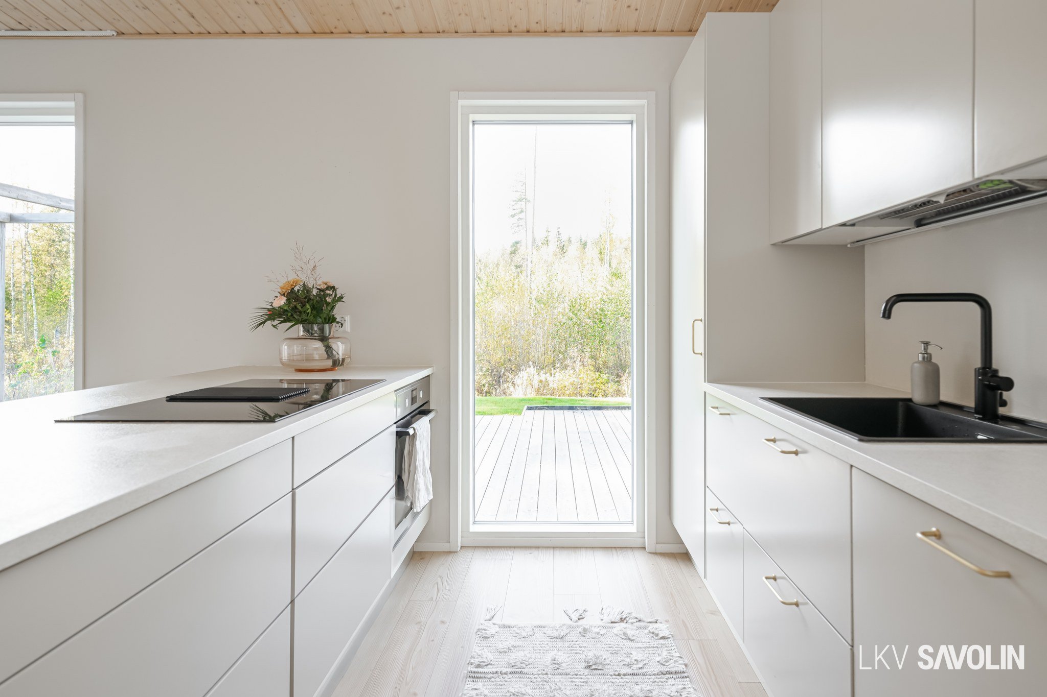 Lattiasta kattoon olevat ikkunat tuovat runsaasti valoa sisätiloihin.