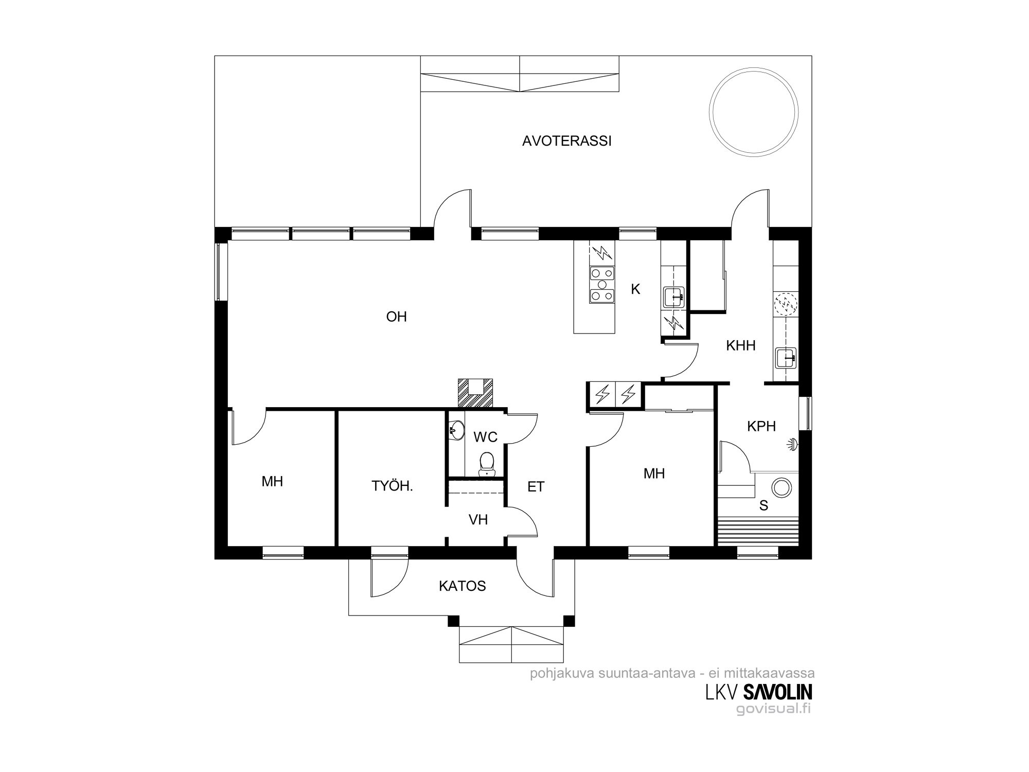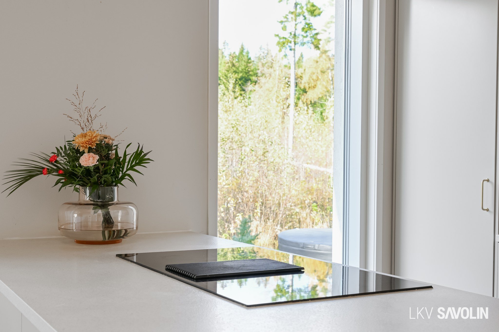 Olohuoneen suuret lattiasta kattoon ulottuvat ikkunat tuovat runsaasti luonnonvaloa sisätiloihin ja luovat avaran tunnelman. Ikkunoista suojaisat näkymät koivikkoiseen metsämaisemaan. Olohuoneesta suora pääsy takapihan länteen avautuvalle terassille, jossa mukava kuunnella lähimetsän lintujen laulua ja nauttia samalla ilta-auringon säteistä.